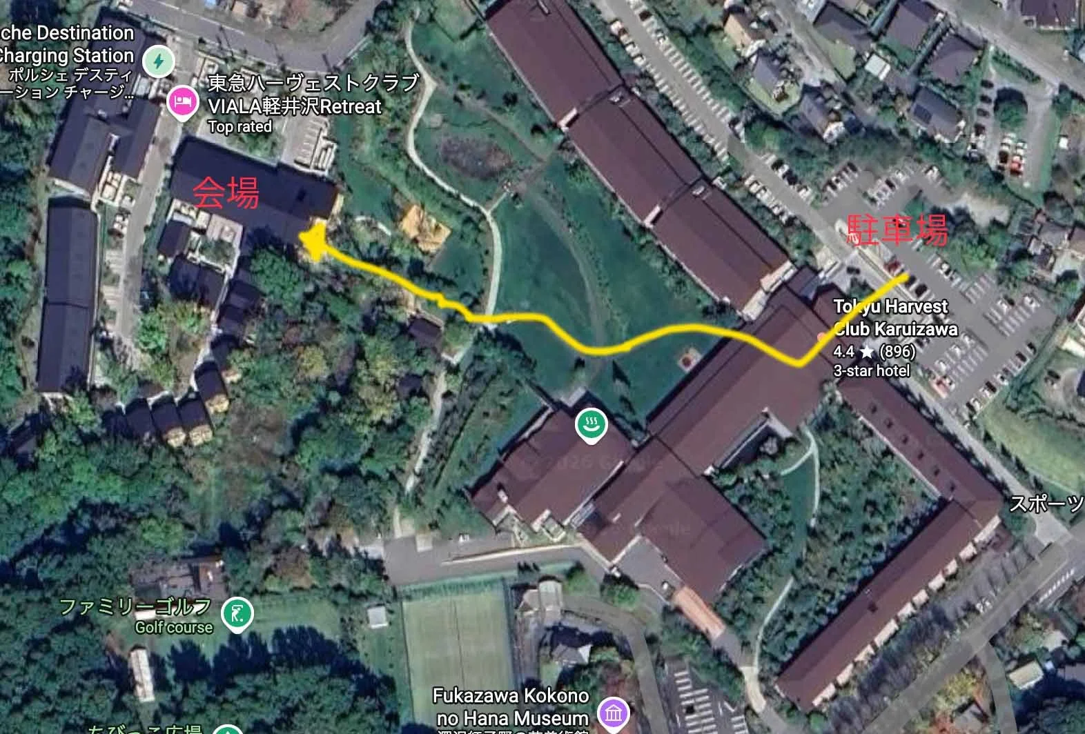 駐車場は、東急ハーヴェストクラブ 軽井沢の駐車場をご利用ください。そこから会場まで敷地内徒歩3分ほどです。マップをご参照ください。